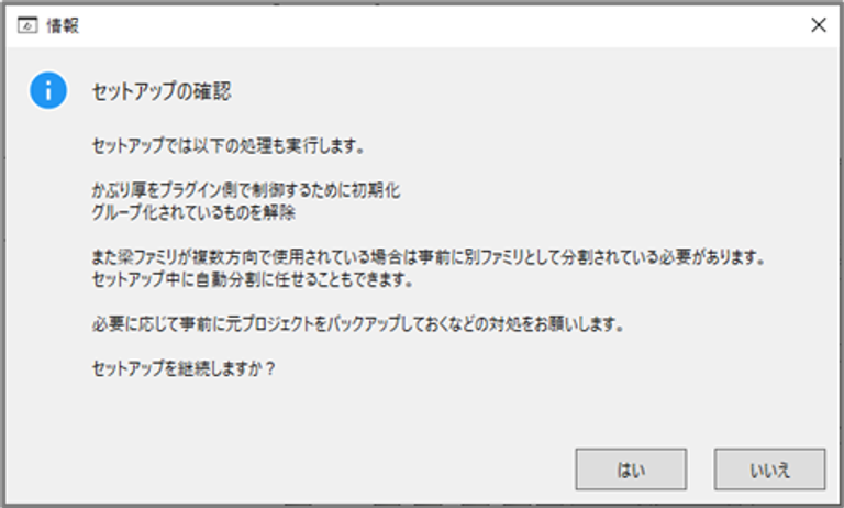- 「セットアップの確認」ダイアログボックスが表示されます。 プロジェクトファイルの設定変更を行うため、あらかじめバックアップを取るよう促す内容が記載されています。[はい]をクリックし先へ進みます。