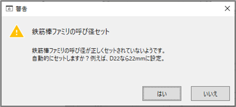 - Revit2022以降で、かつ鉄筋棒のタイプの中に「鉄筋径」パラメータの値がタイプ名と一致していない場合に「鉄筋棒ファミリの呼び径セット」ダイアログが表示されます。 ここでは「鉄筋径」パラメータの値を呼び径に合わせる処理を自動で行います。 鉄筋の長さなどの計算には呼び径を使用する箇所があるため、基本的には[はい]をクリックして先に進みます。