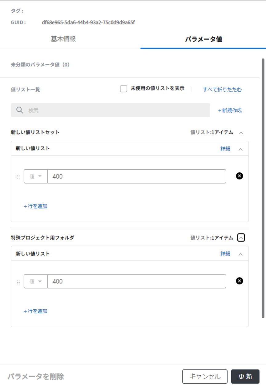 パラメータの詳細や、値リストの中身の編集が可能です。